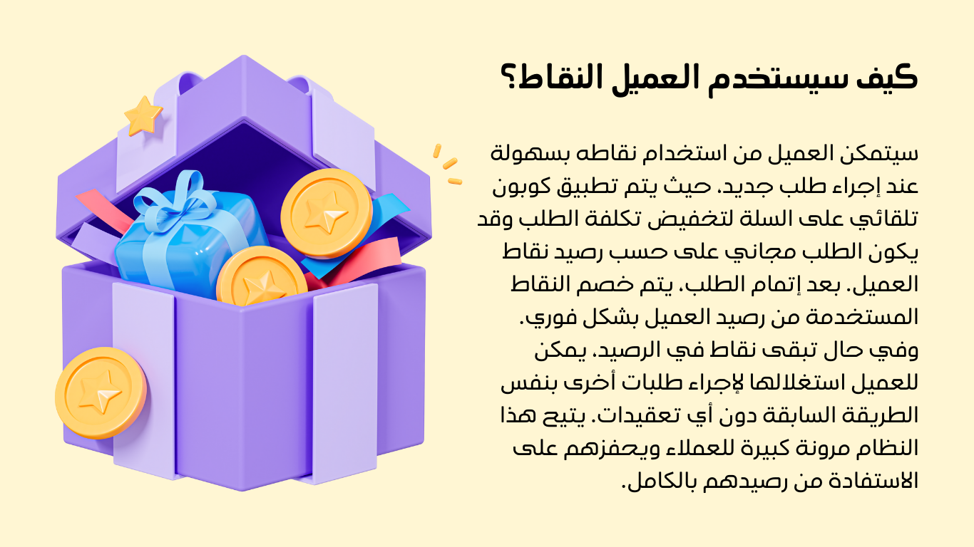 - توفير السهولة للعملاء للاستفادة من رصيد النقاط في مشترياتهم القادمة دون تعقيدات