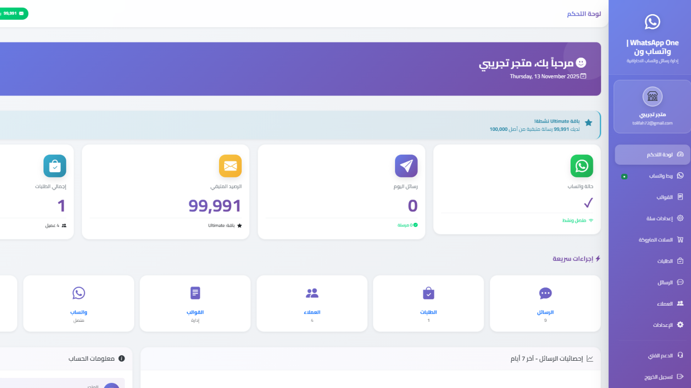 واجهة لوحة التحكم مصممة باللغة العربية ومباشرة، تتيح مراجعة وإعداد كل القوالب وتعديلها أو اختبارها دون الحاجة لإجراءات معقدة. كذلك يمكن متابعة جميع الطلبات وإرسال الرسائل يدويًا عند الحاجة بكل مرونة.
