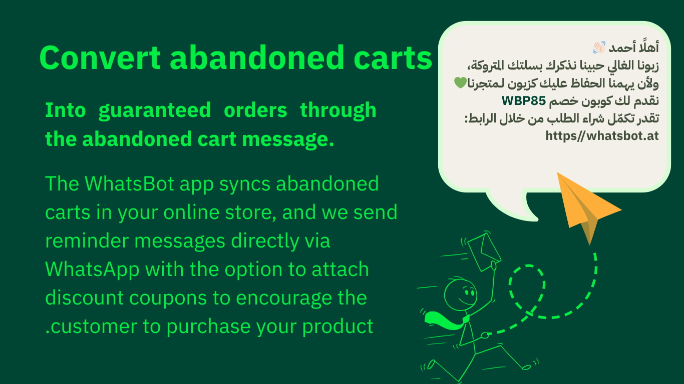يساعد تطبيق واتسبوت في زيادة احتمالية إتمام عمليات الشراء بفضل خاصية تذكير العملاء بالسلات المتروكة بشكل تلقائي وسريع عبر واتساب، مما يزيد من معدل تحويل الزوار إلى مشترين ويقلل من الطلبات غير المنجزة.