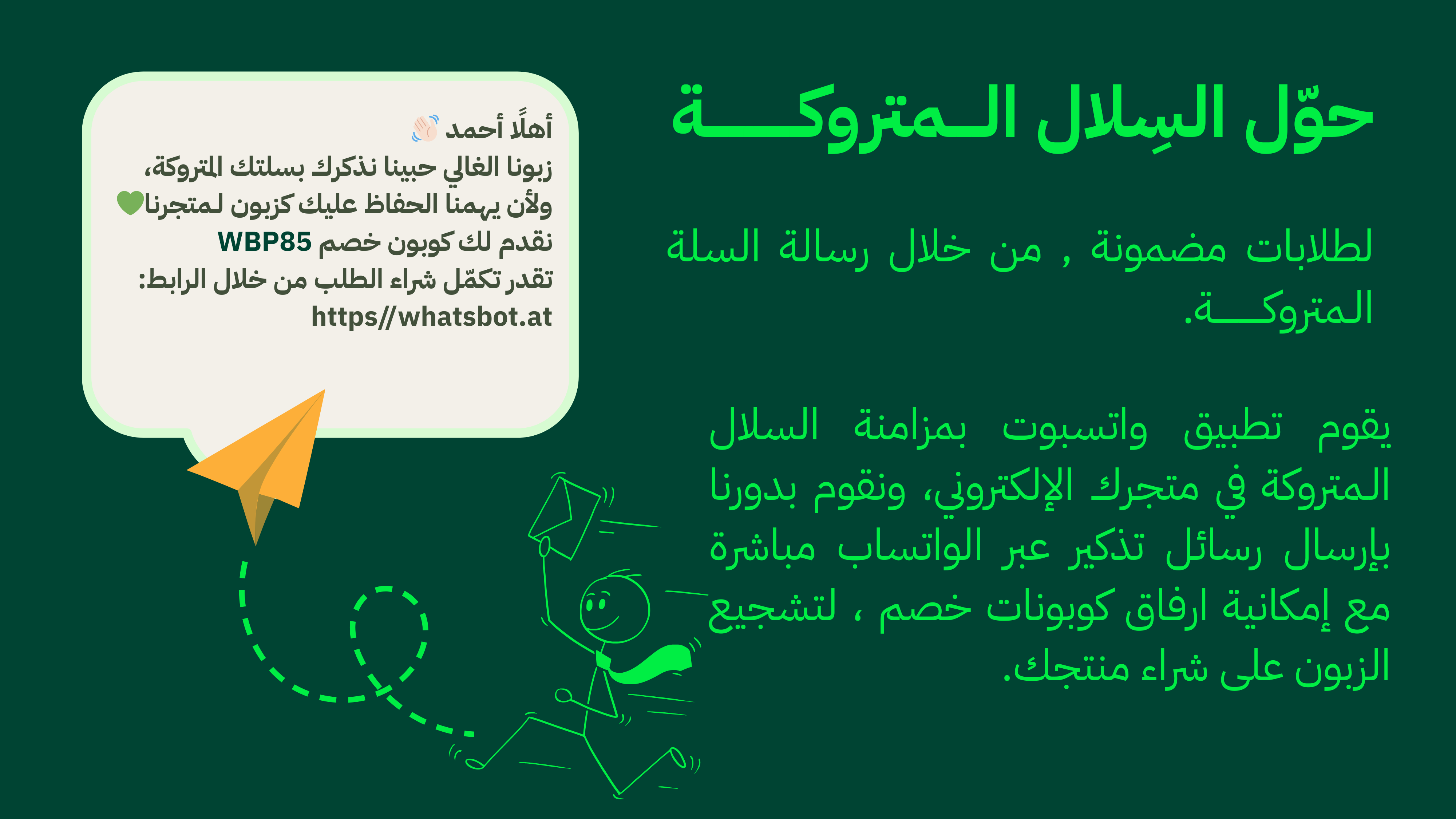 يقدم تطبيق “واتسبوت” حلاً شاملاً للتواصل التلقائي مع عملاء متجرك على منصة سلة، معتمدًا على خدمات واتساب لتنظيم الحملات الترويجية وتسهيل إدارة المحادثات والردود الآلية. يهدف التطبيق إلى تعزيز تجربة العملاء من خلال إرسال الإشعارات مباشرةً على واتساب، بما في ذلك تحديثات الطلبات والتنبيهات حول السلات المتروكة، بالإضافة إلى حملات تسويقية رسومية وتفاعلية عبر واجهة واحدة متكاملة.
