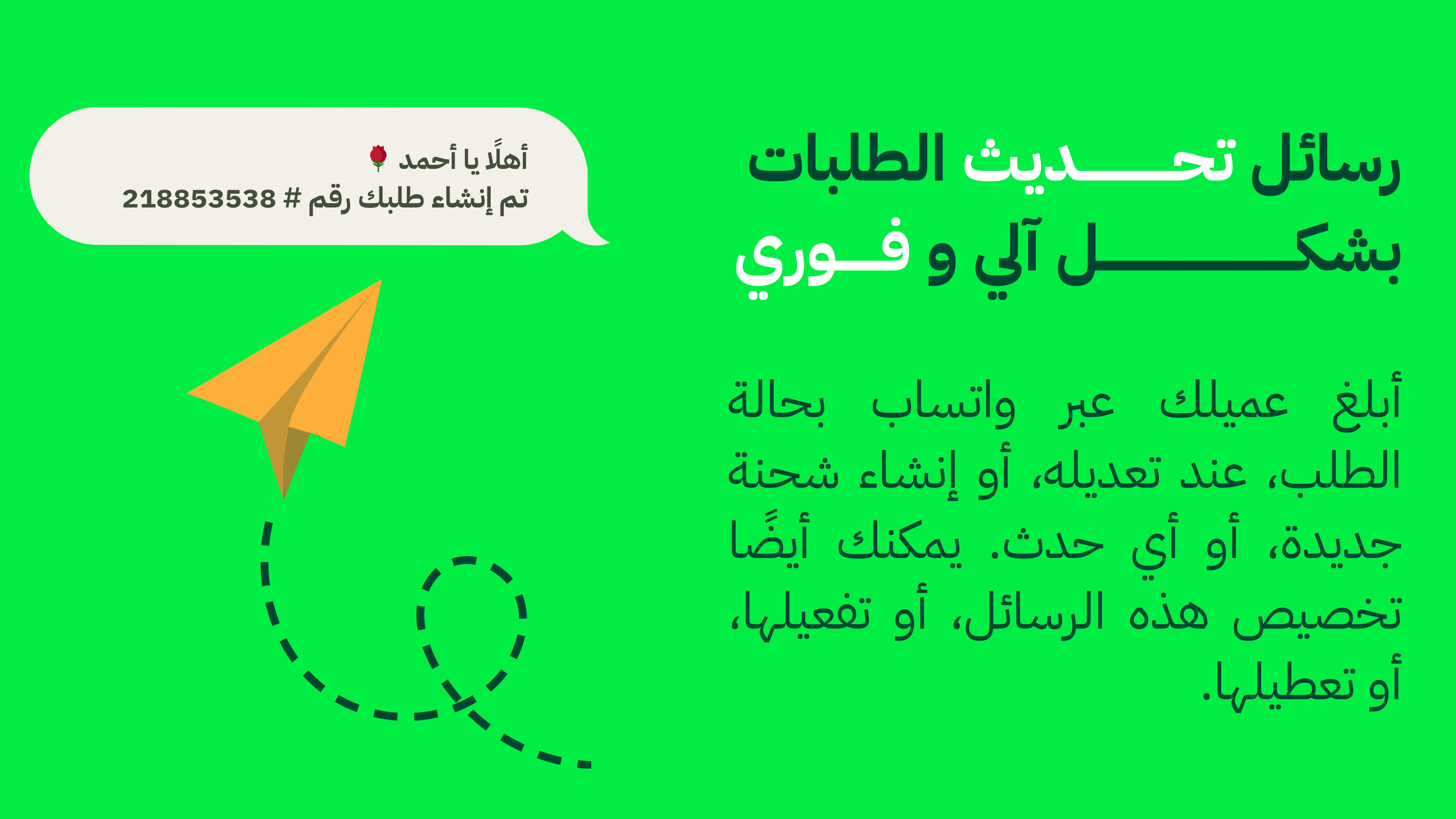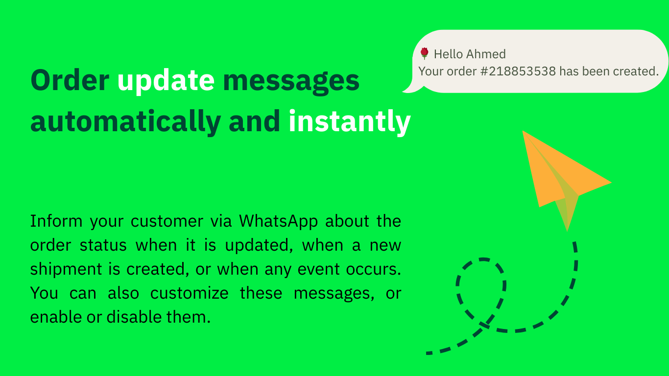 - إرسال إشعارات تحديث حالة الطلب أو إنشاء طلب جديد أو شحن الطلب بشكل فوري عبر واتساب