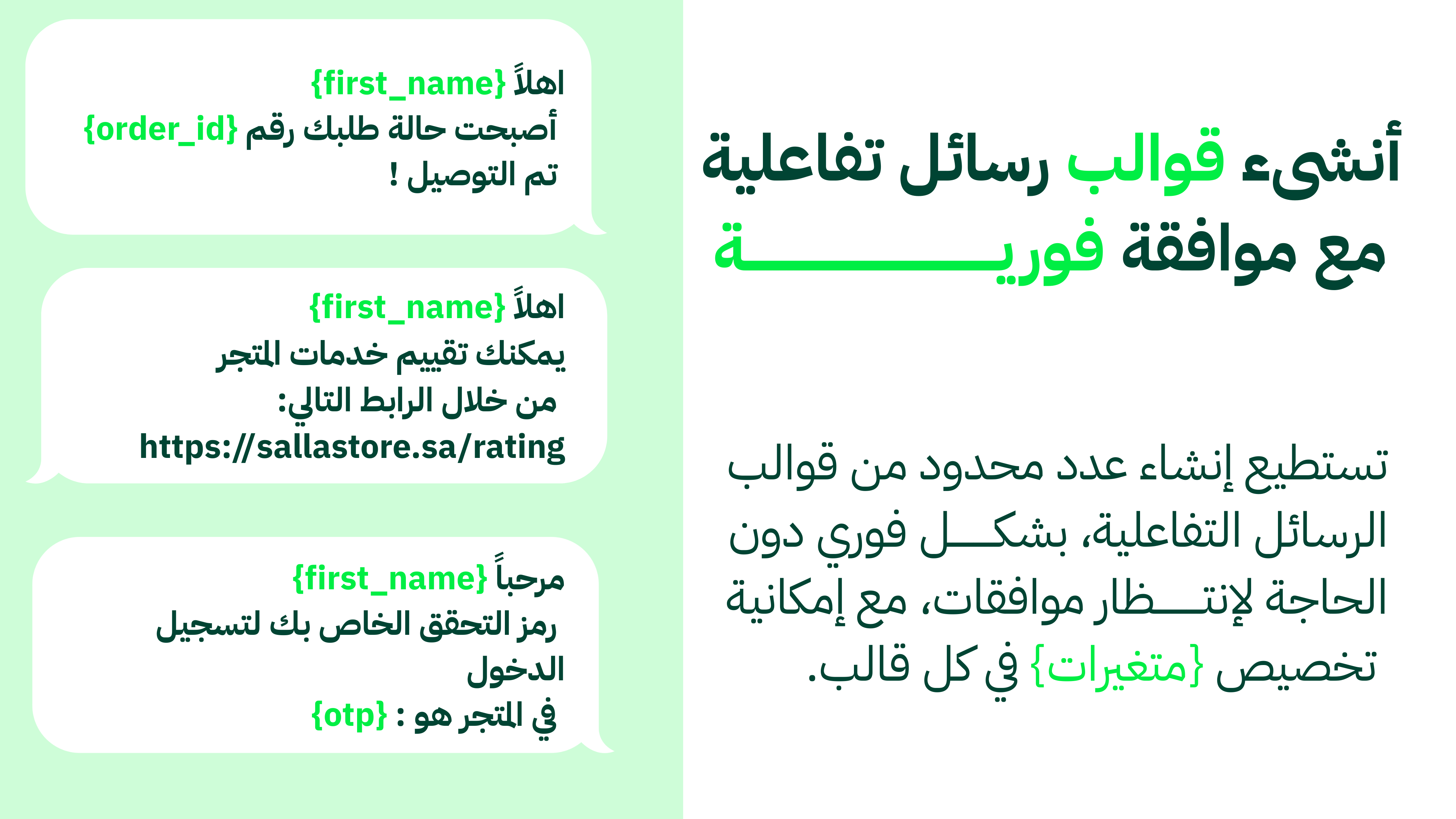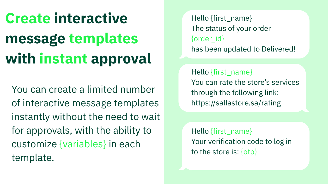 - تخصيص قوالب الرسائل مع متغيرات ذكية كالاسم، رقم الطلب، رابط إتمام الشراء، رابط المنتج الرقمي وغيره