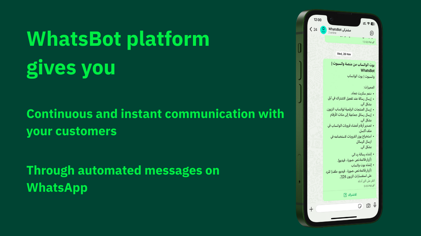 إذا كنت تدير متجرًا إلكترونيًا على منصة سلة وترغب في تفعيل قناة تواصل فعالة ومباشرة مع العملاء عبر واتساب، فإن تطبيق واتسبوت يقدم لك مجموعة متكاملة من الأدوات لإشعار العملاء، رد تلقائي على استفساراتهم، والترويج لعروضك بطريقة ذكية ومخصصة.