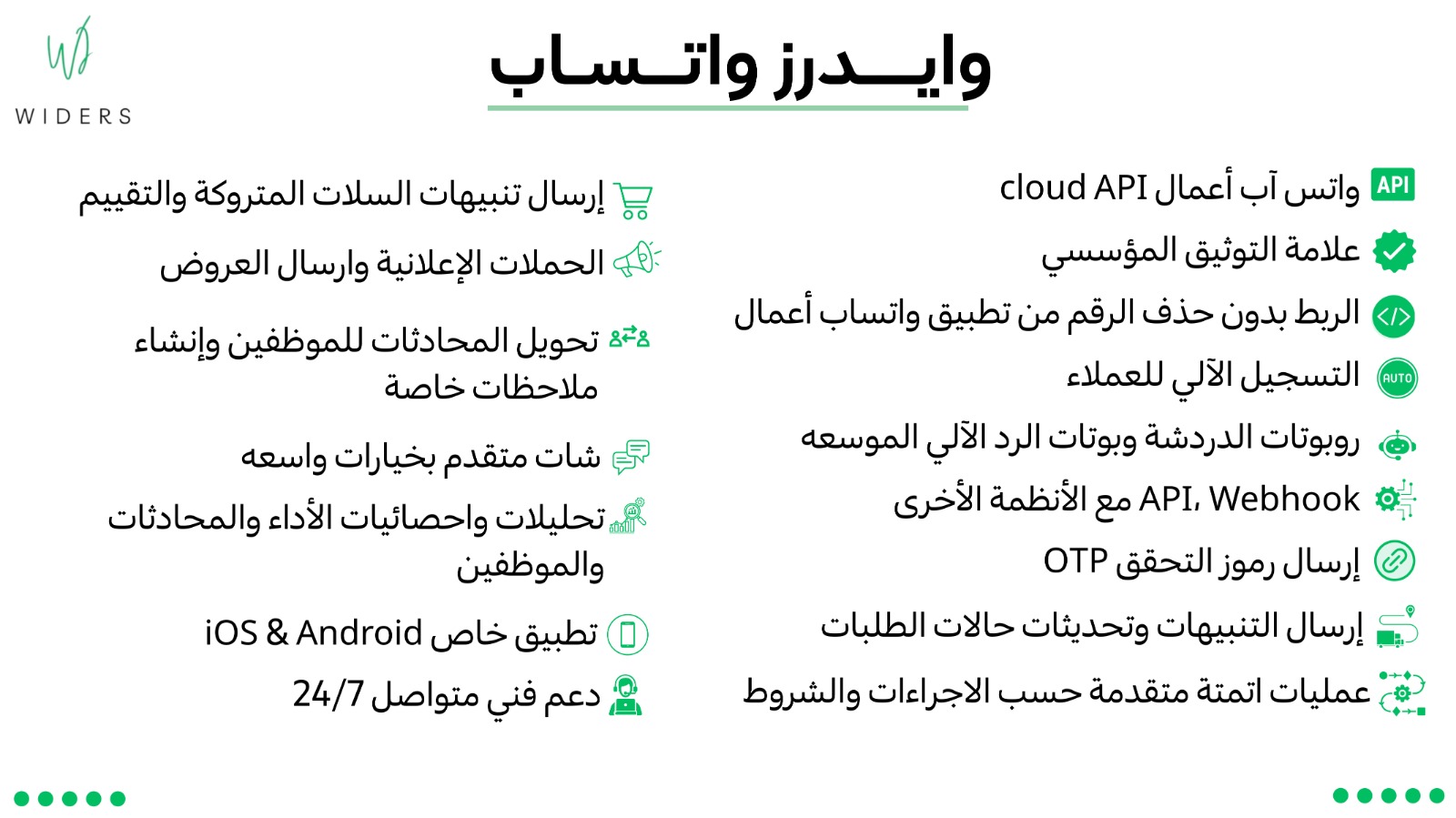 تطبيق وايدرز واتساب صُمم خصيصًا لمتاجر منصة سلة بهدف تعزيز قنوات التواصل عبر واتساب بشكل احترافي وآمن. يقدم هذا التطبيق حلاً متكاملاً للربط الرسمي مع منصة ميتا (Facebook Business)، مما يمكّن التاجر من استخدام كافة مزايا واتساب أعمال API، وتحقيق الاستفادة القصوى من أتمتة المحادثات، دعم العملاء، وإدارة فرق العمل.
