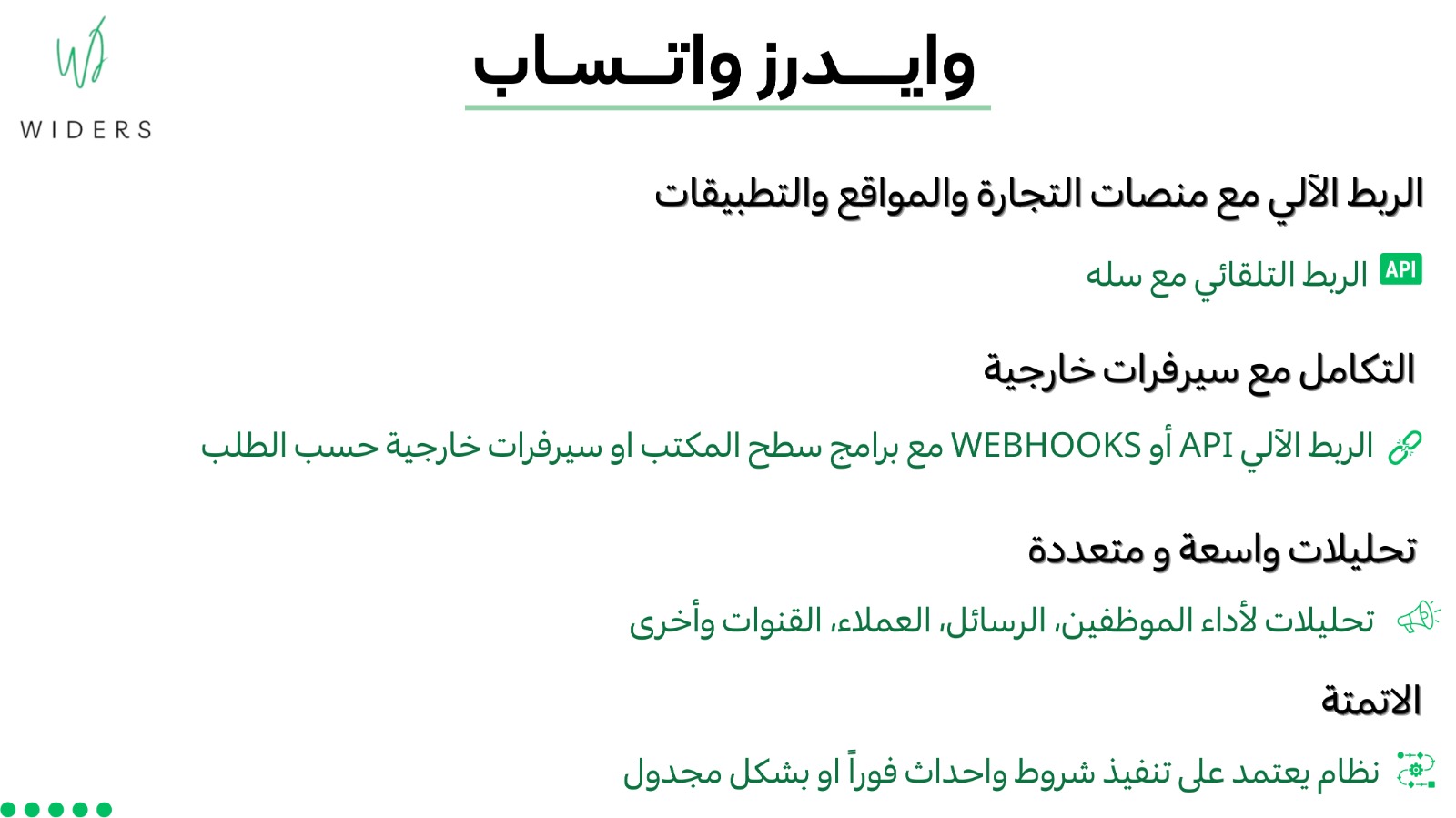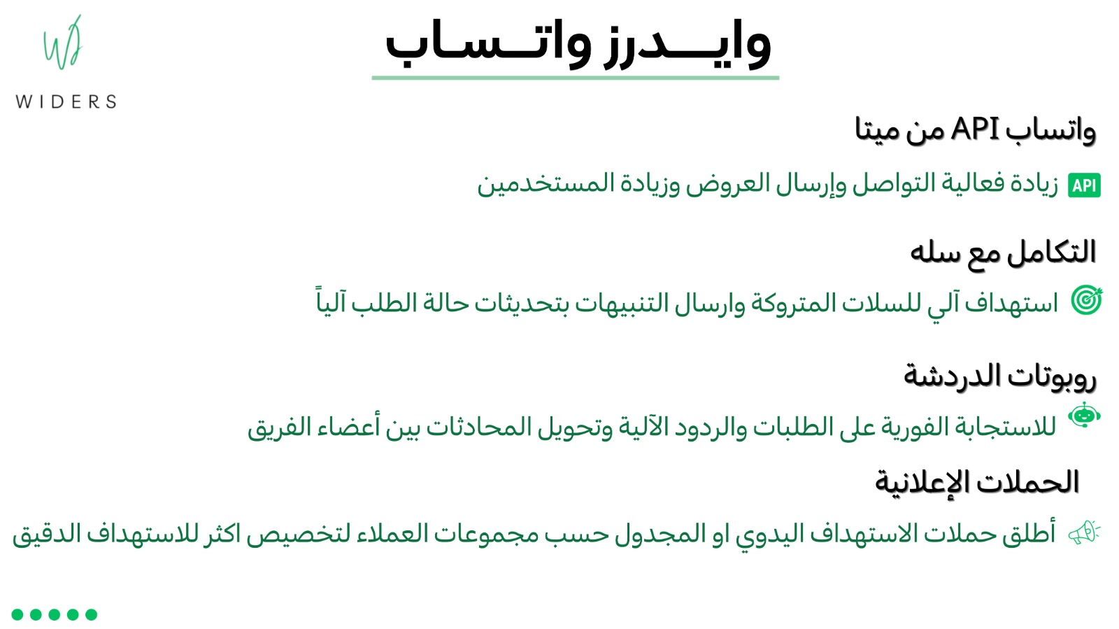 - ربط رسمي مع واتساب أعمال API والحصول على توثيق من ميتا لرفع الموثوقية وإرسال الرسائل التجارية دون حدود.