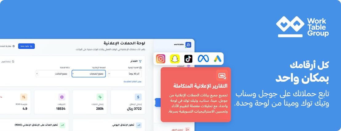 الاعتماد على ورك تيبل يعزز قدرة التاجر على السيطرة الكاملة على عمليات التسويق ومهام الفريق من مكان واحد. عبر ربط الحملات التسويقية بالنتائج الفعلية، تصبح قرارات الاستثمار في الإعلانات دقيقة، مما يقلل إهدار الميزانية ويزيد العائد على الإنفاق التسويقي.