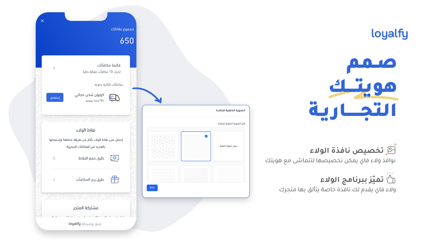 يوفر التطبيق تحكمًا شاملًا للتاجر في تصميم نافذة الولاء لتواكب هوية المتجر البصرية بالكامل، من الألوان إلى تفاصيل الواجهة. كما يمكن للتاجر تحديد كيفية توزيع النقاط على الأنشطة المختلفة، وطريقة الاستبدال وعدد النقاط المطلوبة لكل مكافأة، وصلاحية العروض والمكافآت، وبناء برنامج الولاء بما يتوافق مع استراتيجية العلامة التجارية واحتياجات العملاء.