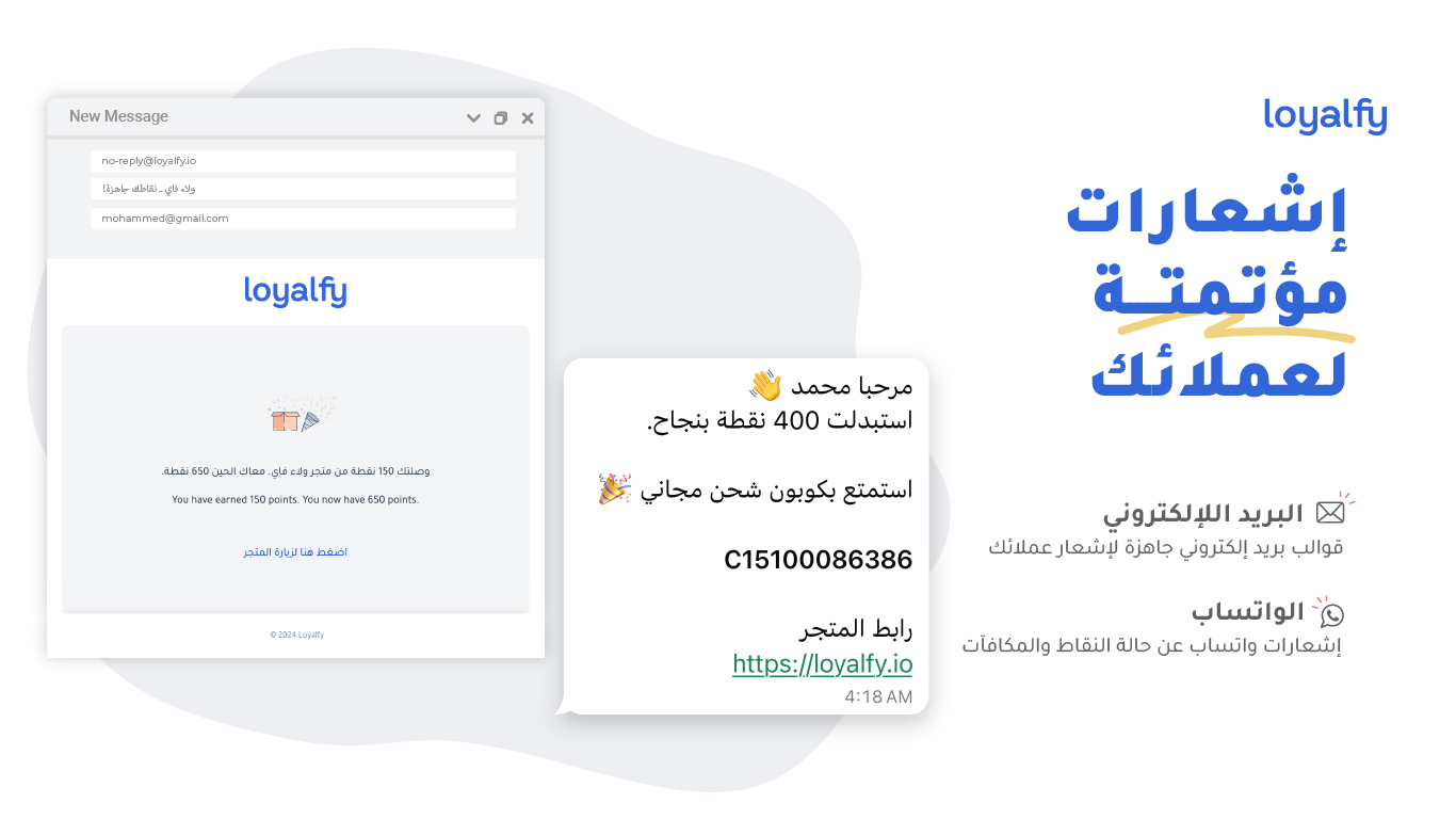 • إرسال إشعارات عبر البريد الإلكتروني لتحديث العملاء بشأن نقاطهم ومكافآتهم