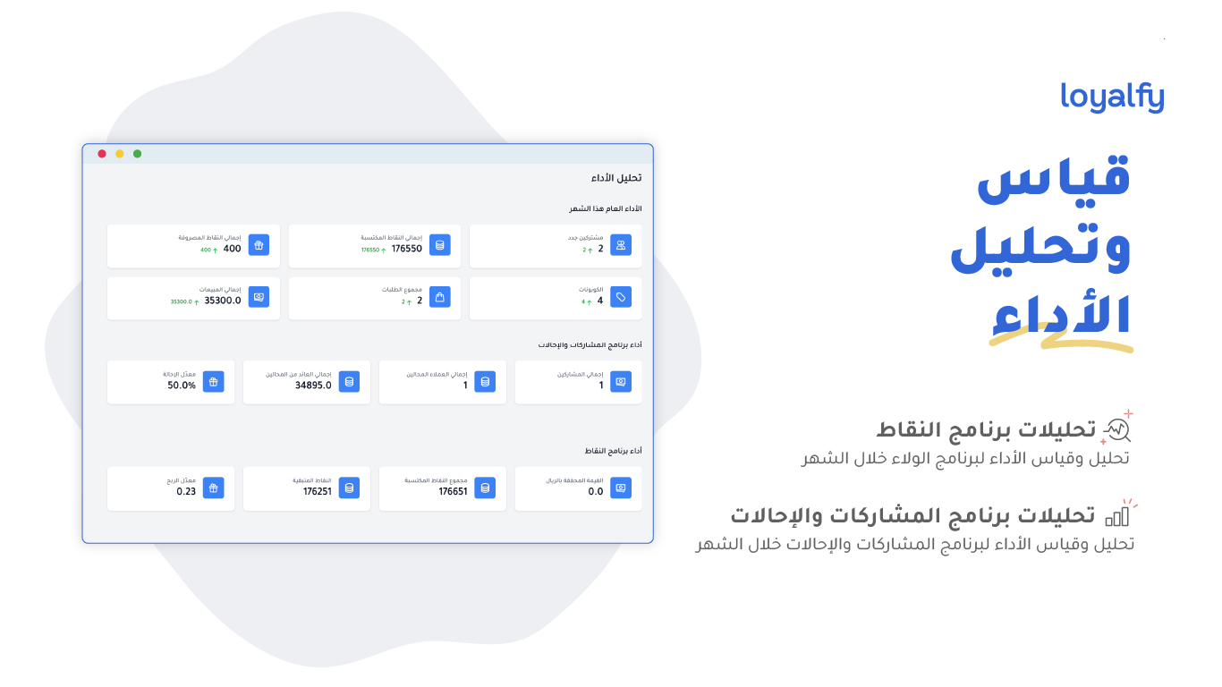 تتيح التحليلات المفصّلة فهم أعمال البرنامج وقياس العائد من استثمارك في الولاء، ما يمنحك القدرة على تطوير العروض والحملات التسويقية بناءً على بيانات دقيقة حول سلوك عملائك.