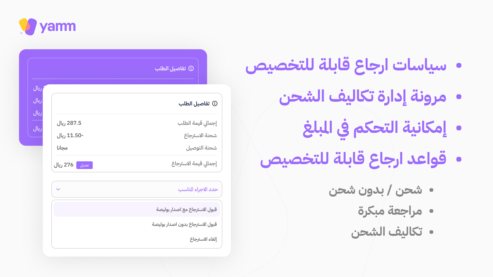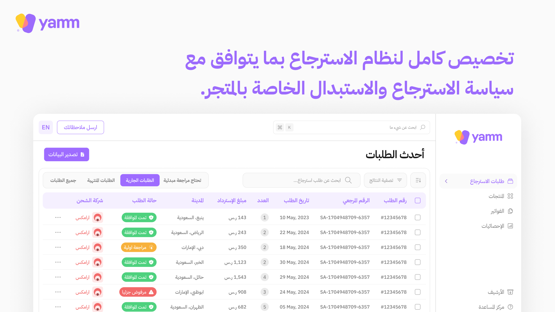يركّز تطبيق يمّ على الحفاظ على سياسات متجرك الحالية دون فرض أي تغييرات على سياسات الاسترجاع والاستبدال أو شحن المنتجات. يدعم التطبيق اندماجاً مرناً مع جميع سياساتك المعتمدة، مما يتيح تخصيص التجربة بما يتوافق مع احتياجات متجرك ونوعية عملائك.
