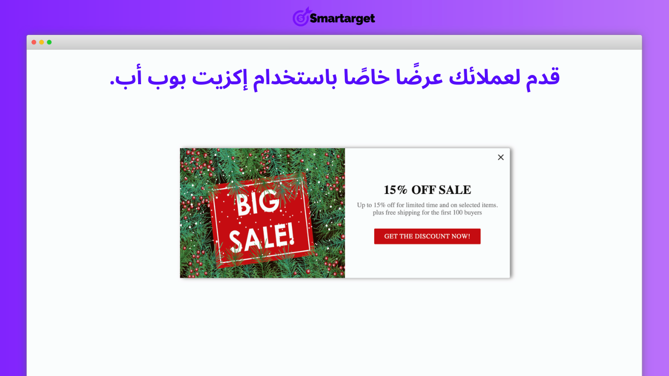 تعرض هذه النافذة رسالة مخصصة بحسب ما يحدده التاجر، مثل إشعار بعرض خاص أو تنبيه حول منتج جديد أو خصم مخصص. يستغرق التطبيق لحظات فقط للكشف عن نية الخروج وتنفيذ إظهار الرسالة، مما يجعل التفاعل سلسًا وغير مزعج للزائر، ويمنح التاجر فرصة ذهبية لتعزيز فرص الاحتفاظ بالعميل.