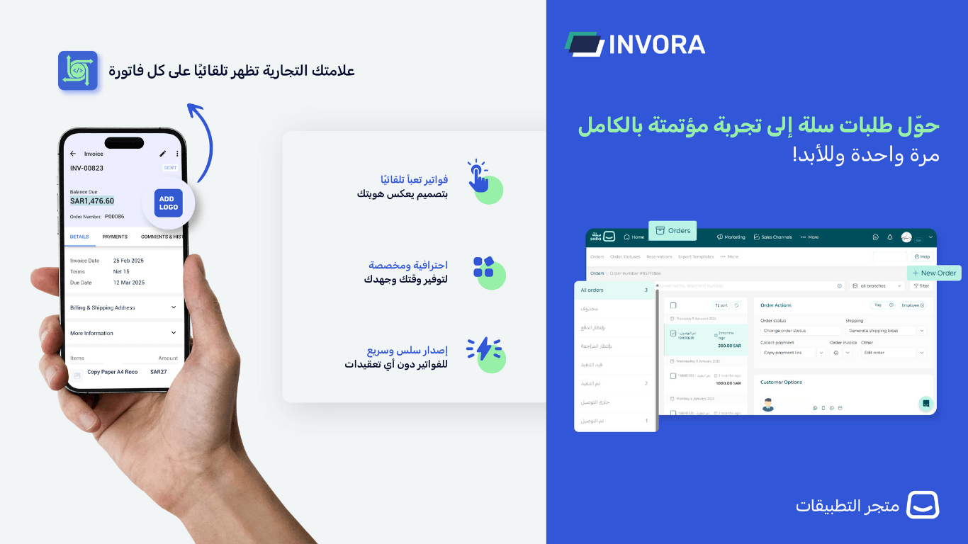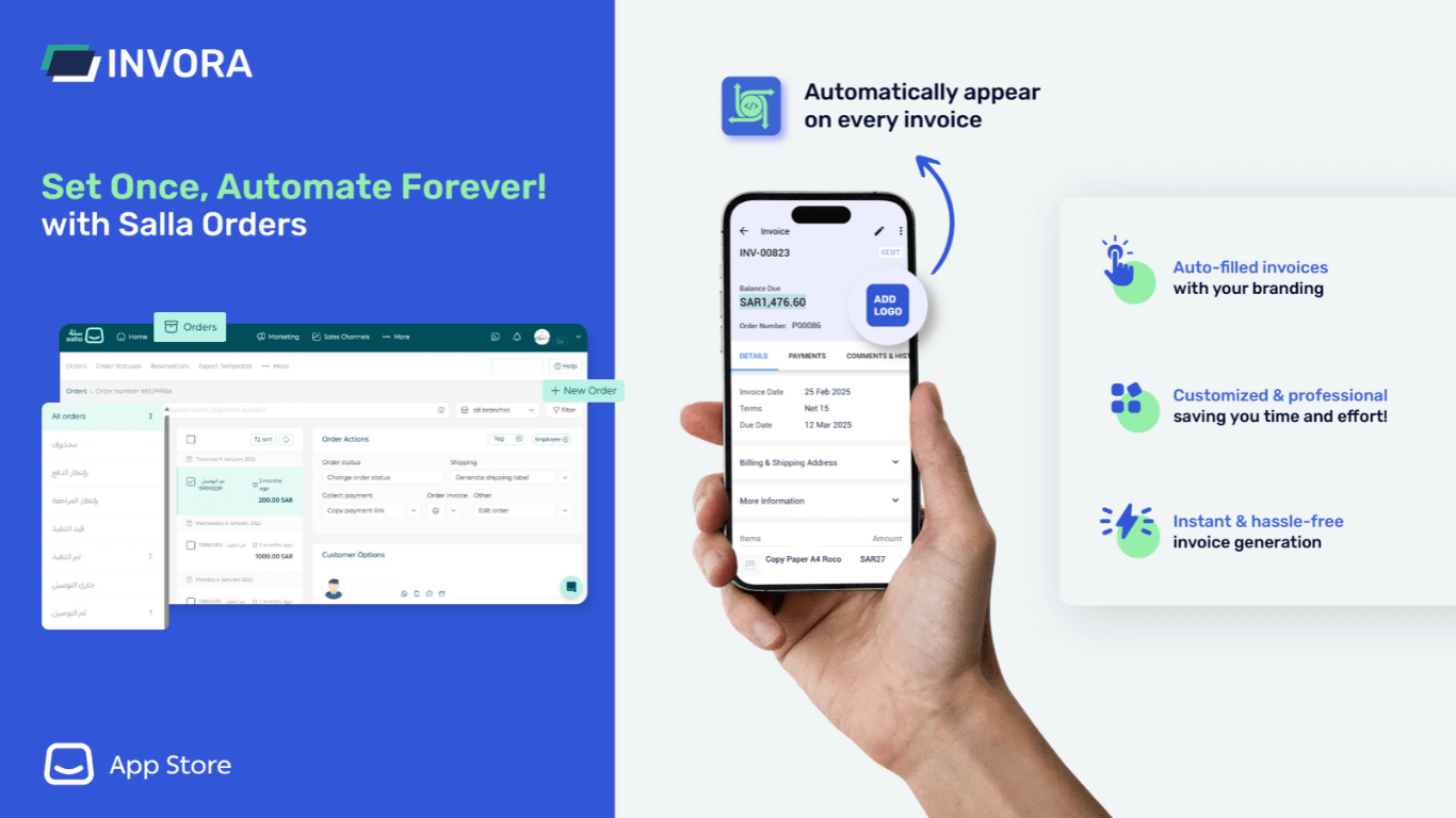 يساعد INVORA أصحاب المتاجر في منصة سلة على أتمتة عملية إصدار الفواتير، ما يقلل احتمالات وقوع الأخطاء ويضمن الالتزام التام بالقوانين الضريبية. لن يحتاج فريق العمل لإدخال بيانات الفاتورة يدويًا أو مراجعة تفاصيل الامتثال بشكل متكرر، إذ تتم العملية بشكل تلقائي ودقيق.