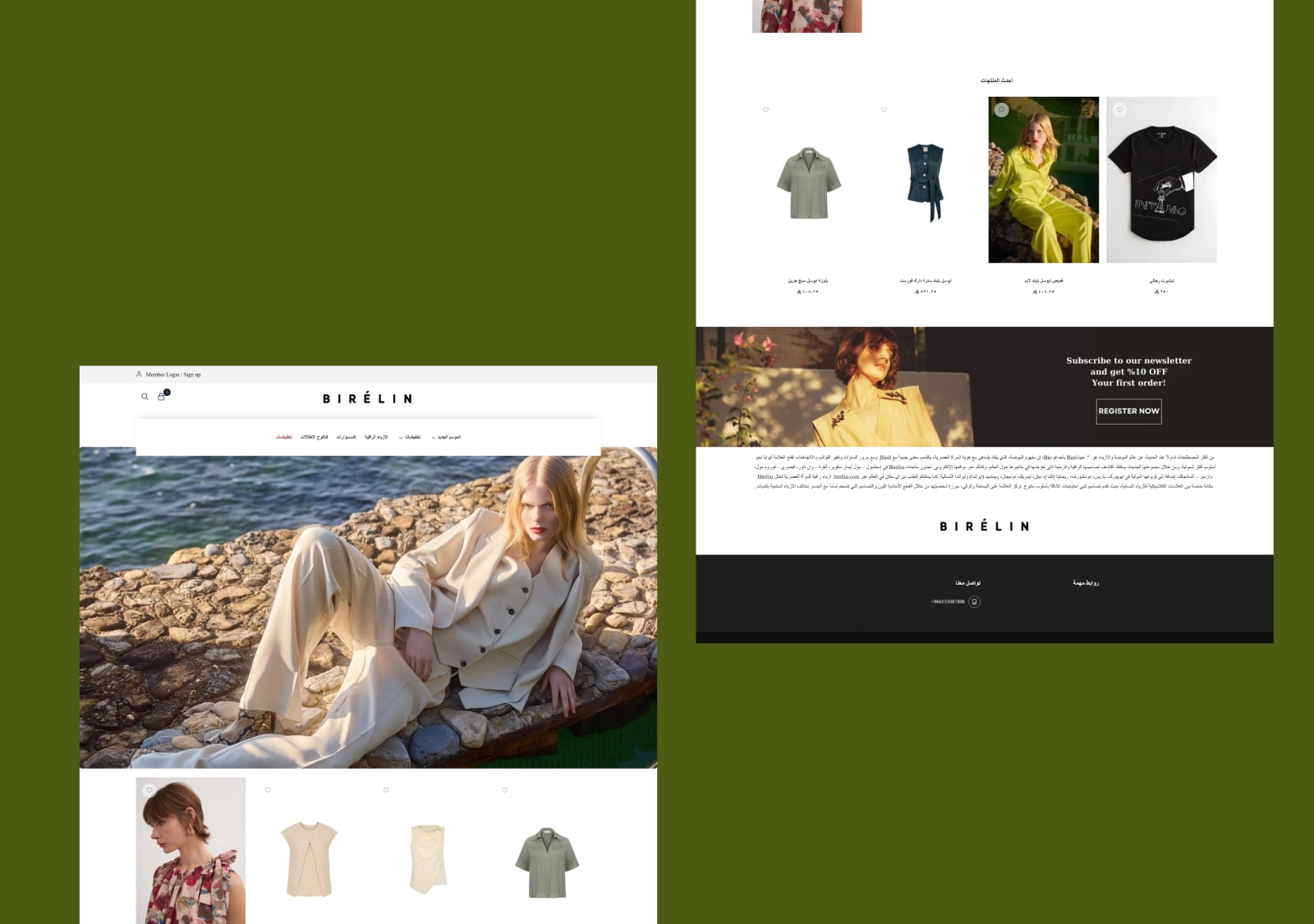 يولي بايرلين أهمية بارزة للنواحي الجمالية وتجربة التصفح للعملاء. تظهر الصور المتحركة والبنرات الواسعة في الواجهة الرئيسية بطريقة تشد انتباه الزائر وتعكس تميز المتجر في قطاع الأزياء. يوفر الثيم أيضاً إمكانية إبراز المنتجات المختارة أو الجديدة من خلال منتجات متحركة أو ثابتة مع توحيد المقاسات، ما يساعد على عرض التشكيلات بشكل منظم وجذاب.