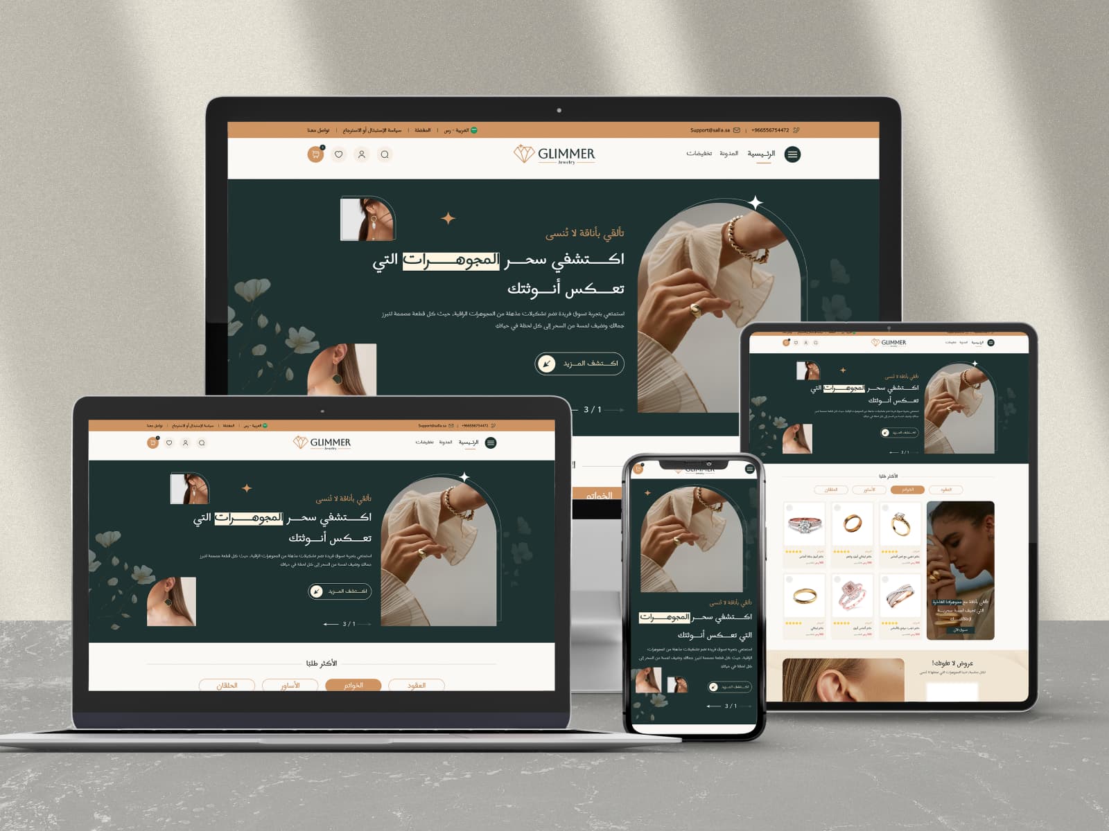 يركز ثيم جليمر بشكل خاص على إبراز عروض المجوهرات والإكسسوارات من خلال عناصر الحركة والأقسام الديناميكية، مما يجعله مناسبًا للتجار من جميع الأحجام الذين يطمحون لتقديم متجر إلكتروني بتصميم متطور وسهل الاستعراض، دون الحاجة إلى معرفة عميقة بمهارات البرمجة أو التصميم.