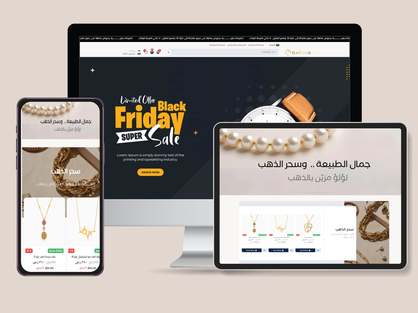 يعتمد ثيم جولدن على مزيج من البساطة والوضوح البصري، مع الاستفادة من الألوان المخصصة لتناسب هوية المتجر وجاذبية منتجات المجوهرات. يبرز استخدام البنرات المتحركة والبنرات العريضة، ما يمنح الصفحة الرئيسية حضورًا ديناميكيًا دون الإخلال بتركيز العميل على العروض الأساسية.