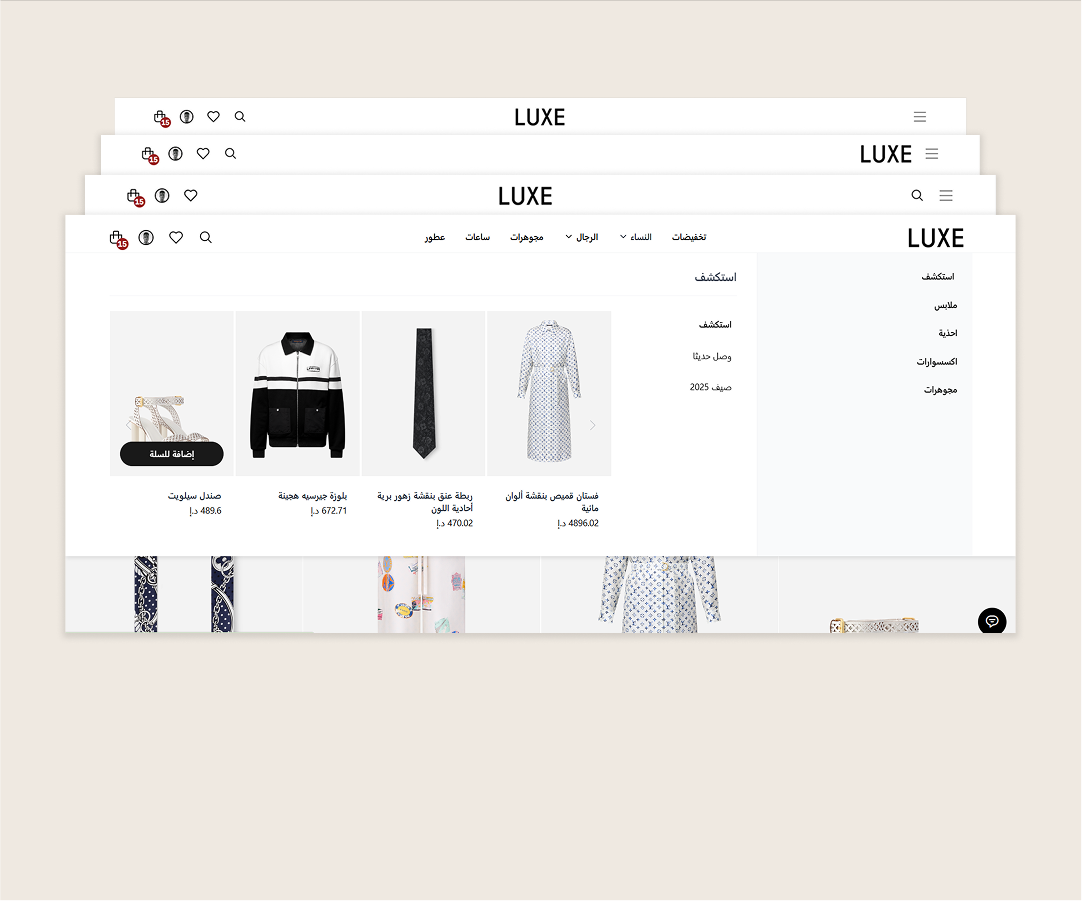 القائمة الموسّعة تسهّل استعراض التصنيفات، وتضفي أنماط الهيدر المتنوعة بعدًا تصميميًا إضافيًا، بينما يسمح البانر العريض والبنرات المرئية بجذب انتباه العملاء للمنتجات أو الحملات المهمة. التنقل السلس، شريط المسار، وتوحيد مقاس المنتجات تساهم جميعها في الحفاظ على عرض متسق واحترافي.