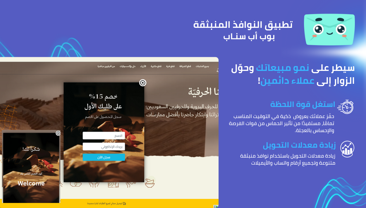 بعيدًا عن الحاجة إلى استخدام أكثر من أداة أو تطبيق، يهدف “النوافذ المنبثقة الذكية” إلى توفير كل ما يحتاجه التاجر لتعزيز تسويق متجره إلكترونيًا عبر منصة زد من نقطة واحدة، مع خيارات تخصيص كاملة تستفيد من نماذج جاهزة ووظائف متقدمة تلبي مختلف الأهداف التسويقية وتصميم تجارب فريدة للزوار.