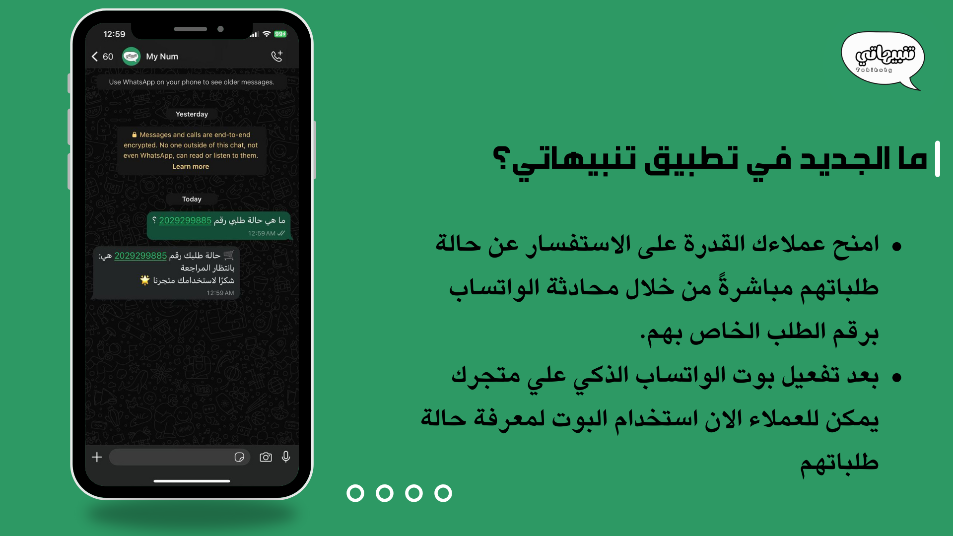 • تحديث حالة الطلبات للعملاء مباشرة: تأكيد، شحن، تسليم أو أي تغييرات أخرى