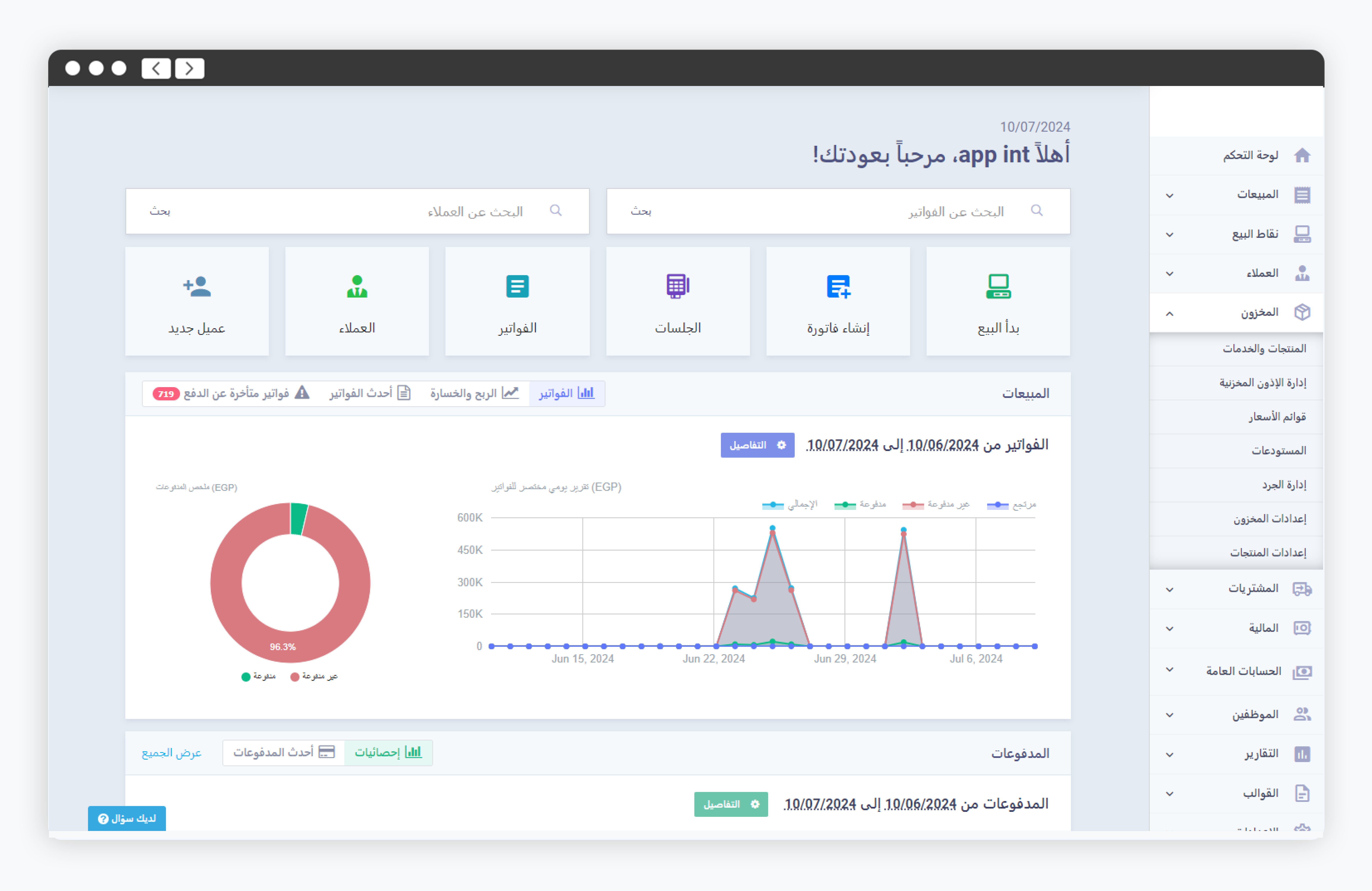 • إدارة كاملة للمخزون مع تحديثات فورية عند البيع أو الشراء لضمان دقة الكميات والمخزون المتوفر