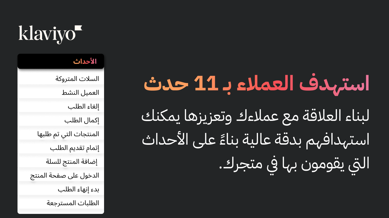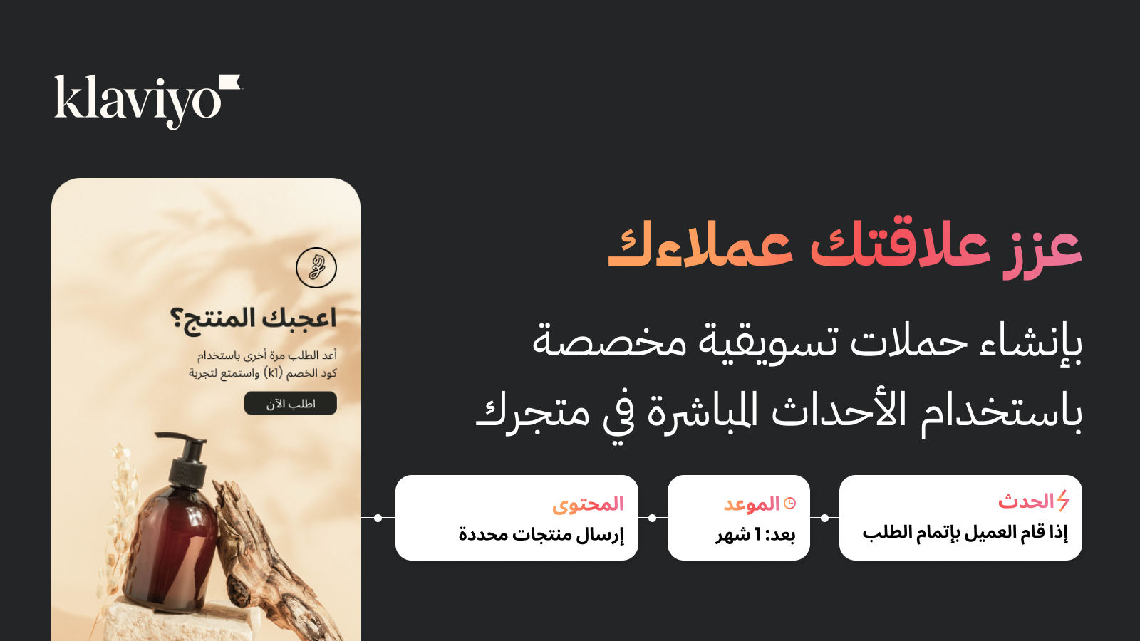 كما يمكنك في كلافيو تحديد قواعد وأتمتة متعددة تعتمد على أحداث مثل إكمال الطلب أو إلغاءه أو حتى زيارة منتج معين، مما يمنحك مرونة عالية في تصميم حملات متجاوبة مع احتياجات كل عميل بدقة.