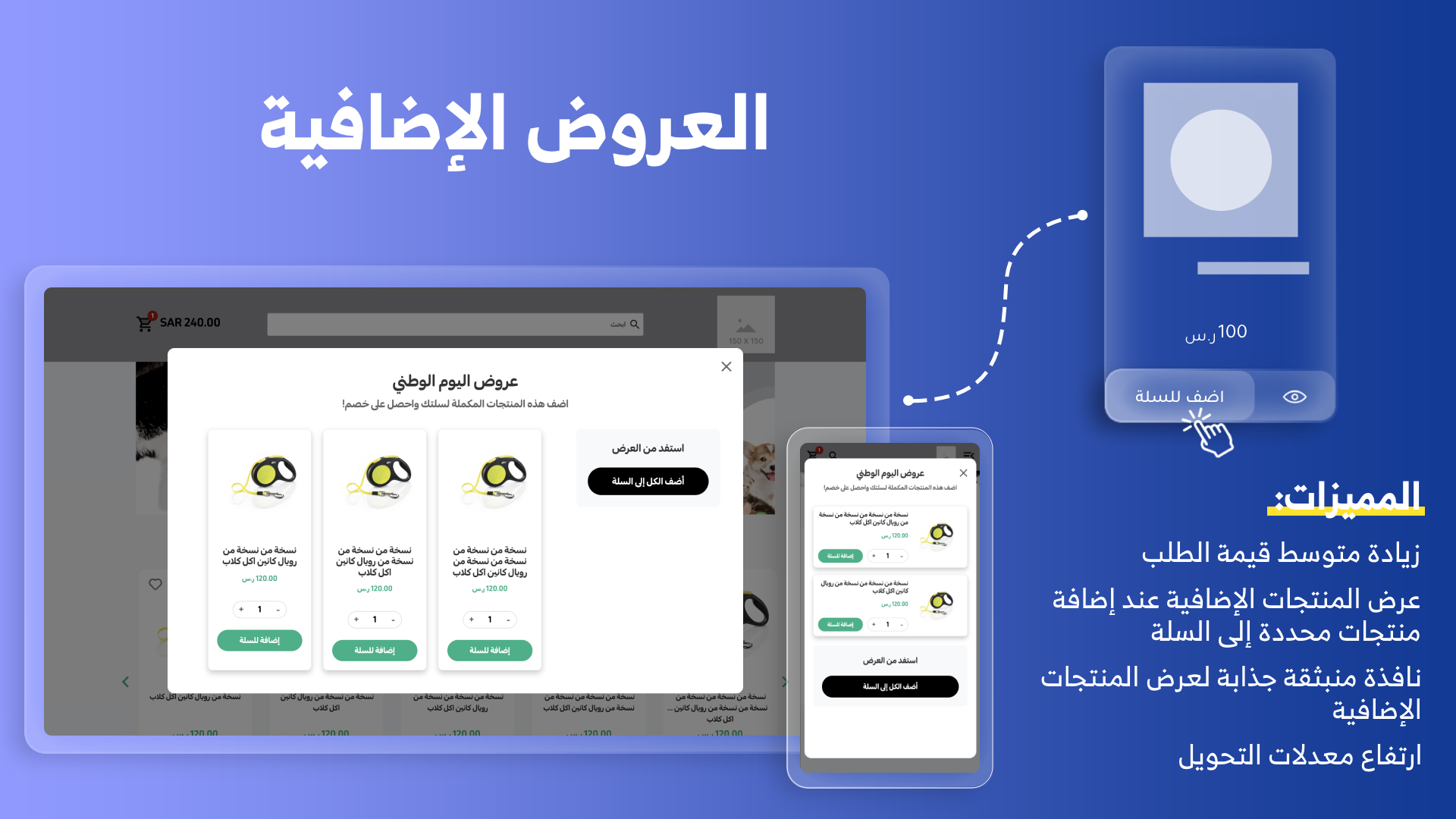 - عروض البيع الإضافية: تقترح تلقائيًا منتجات تكميلية تزيد من إجمالي قيمة الطلب عند إضافة منتجات للسلة، مع تحكم كامل في اختيار المنتجات المعروضة.