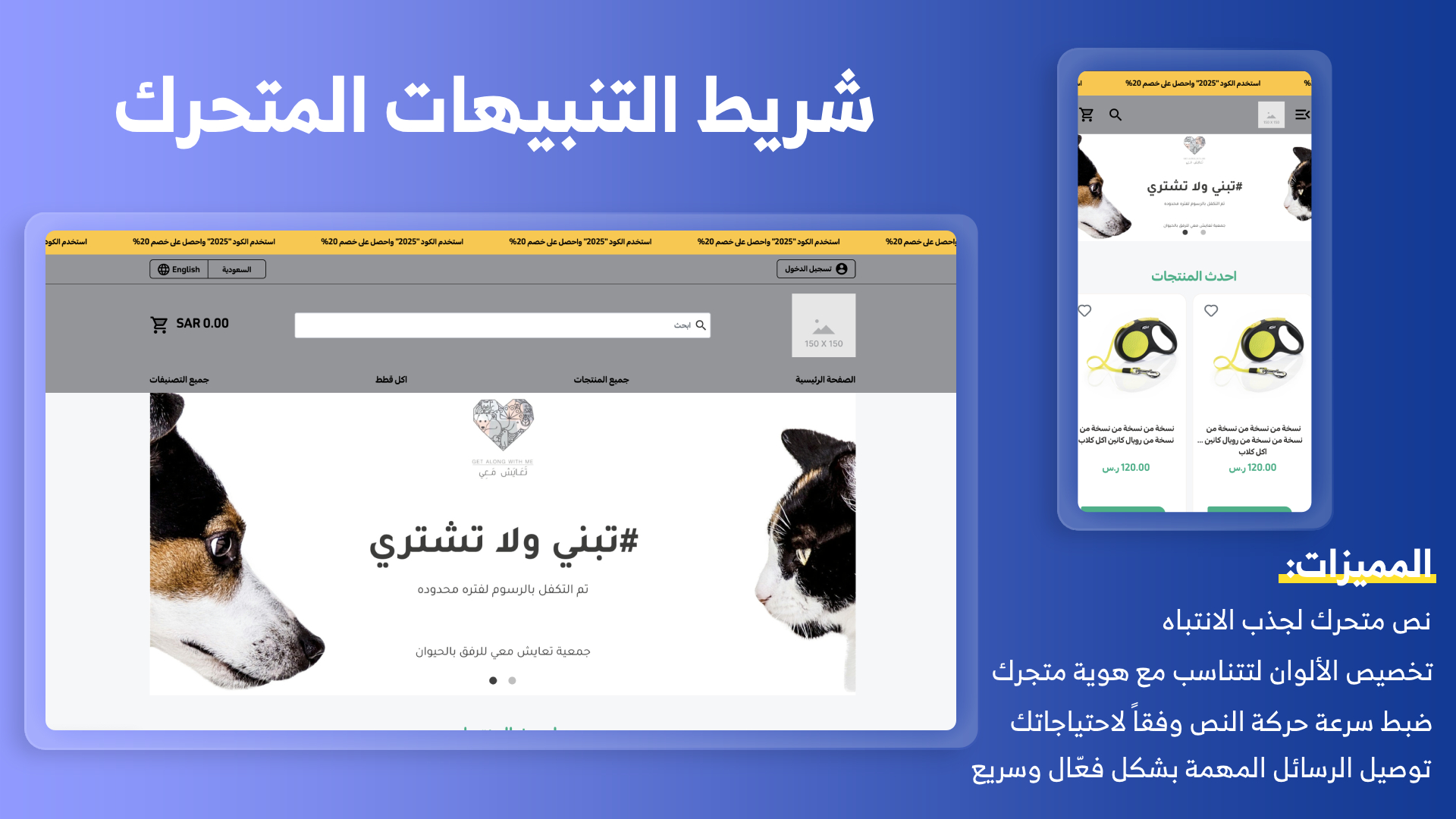 - شريط الإعلانات المتحرك: إمكانية عرض رسائل ترويجية ديناميكية مثل عروض التخفيضات أو المستجدات عبر شريط متحرك قابل للتخصيص في اللون والتأثيرات.