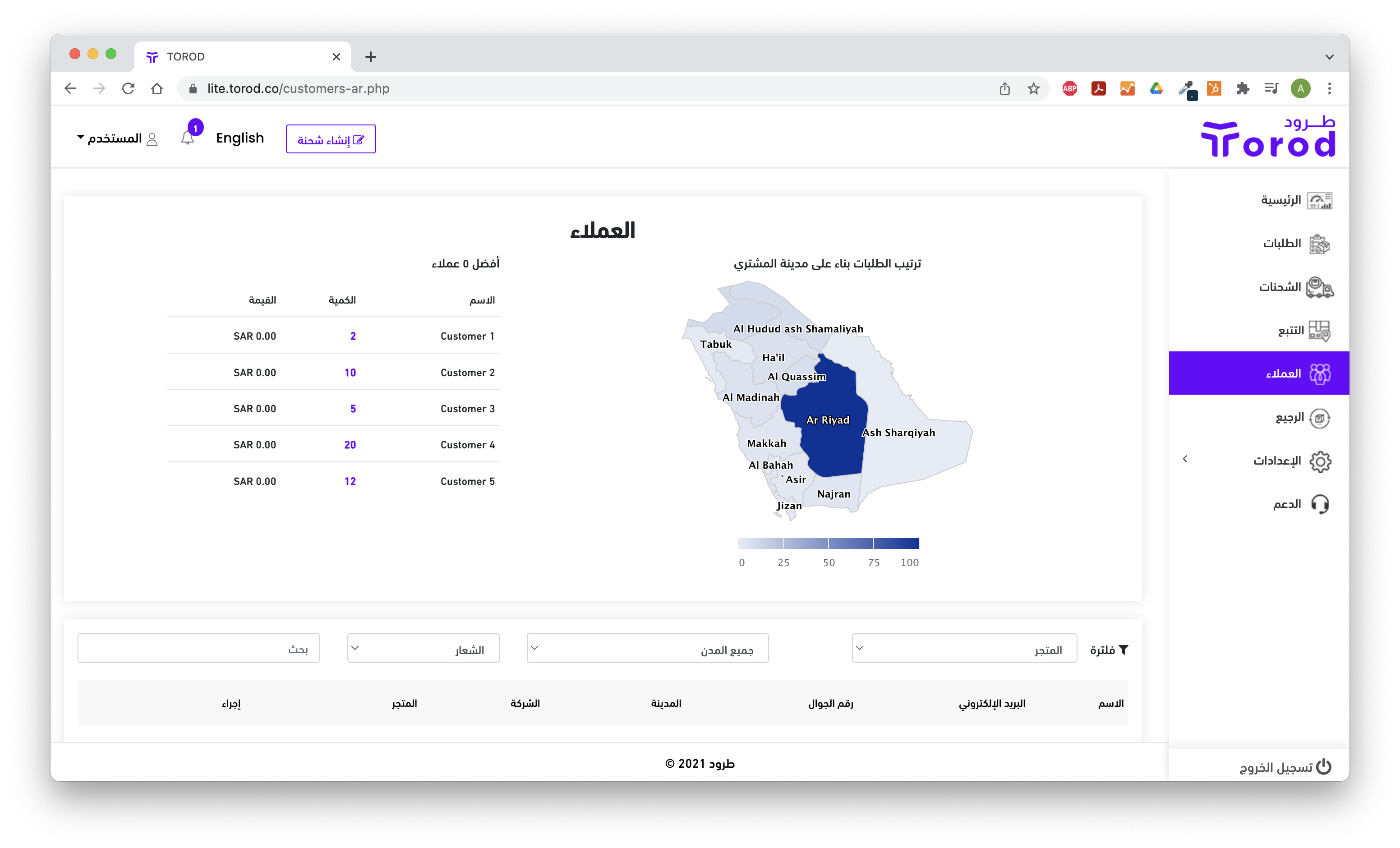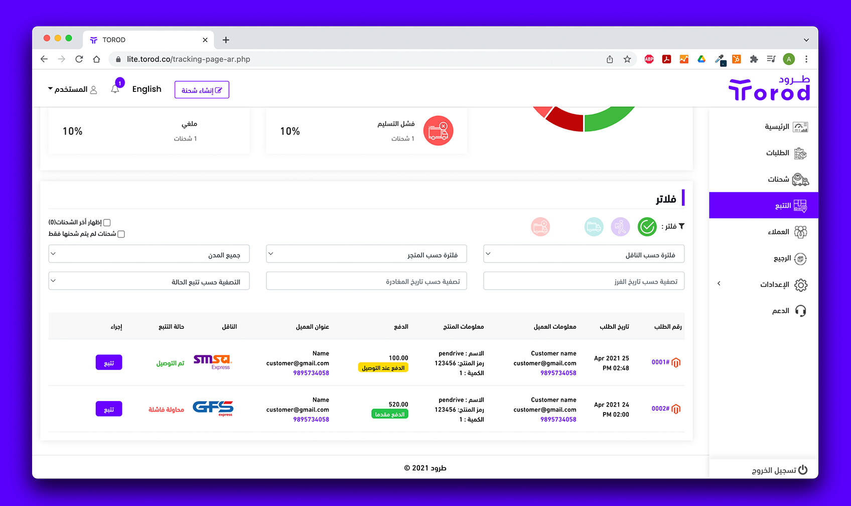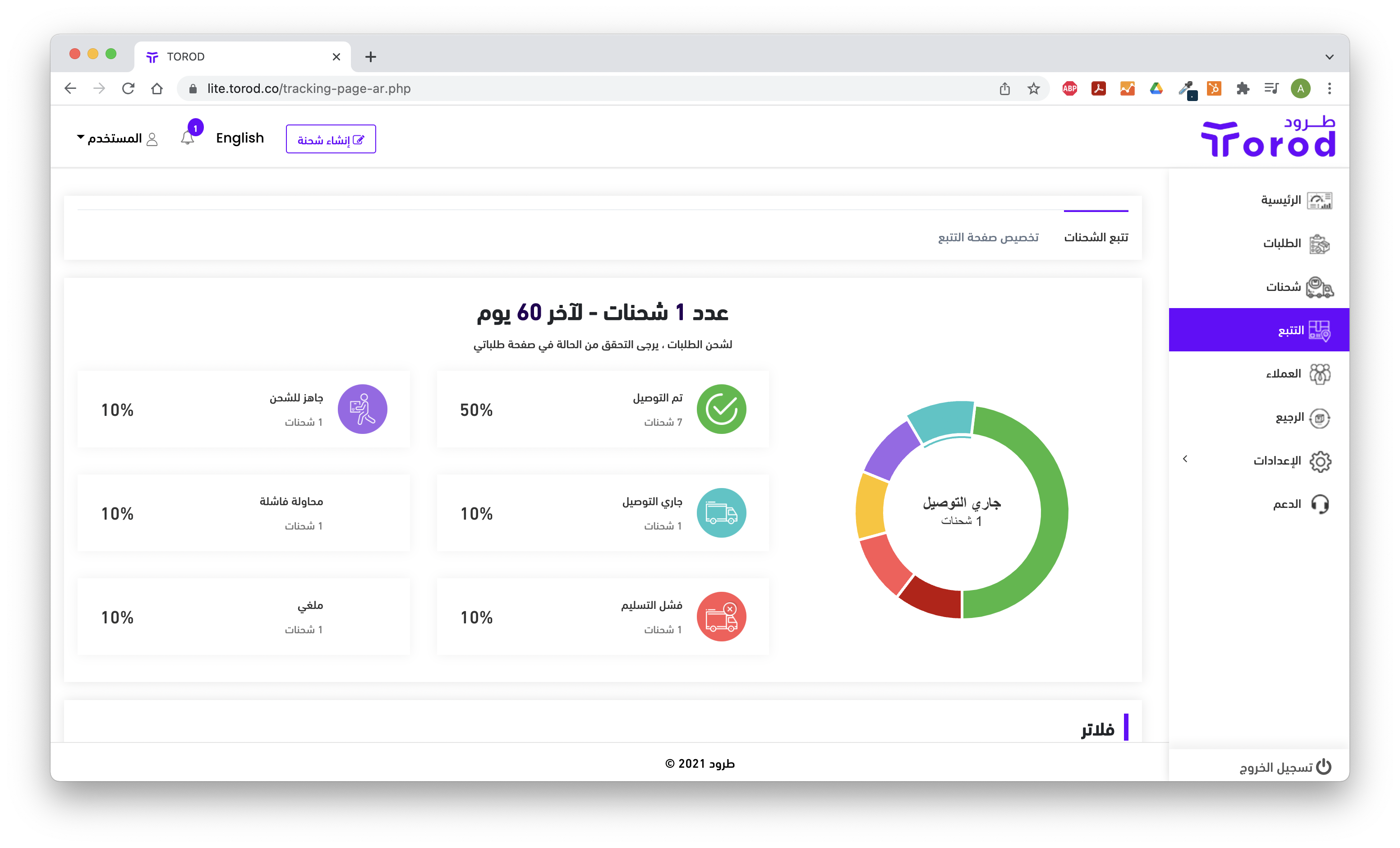 • لوحة تتبع موحدة لجميع الشحنات الصادرة من المتجر عبر الشركات المتعاقد معها