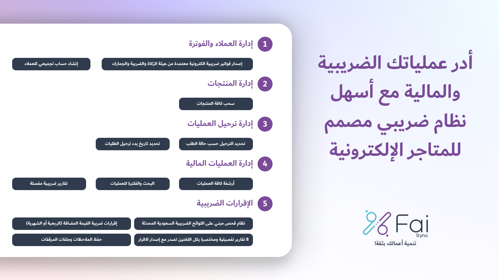 يتميز التطبيق بربط منصات البيع مع الأنظمة المحاسبية المعتمدة، ويسهّل إدارة جميع العمليات المالية من نقطة واحدة، موفراً الوقت والجهد وجاعلاً العمليات دقيقة تلقائية وآمنة. تم تصميم التطبيق ليتناسب مع احتياجات غير المتخصصين في الشؤون المالية، ليمنح كل تاجر تجربة إدارة مالية سهلة، من متابعة المبيعات والفواتير وحتى إعداد الإقرارات بشكل ذكي ومؤتمت.