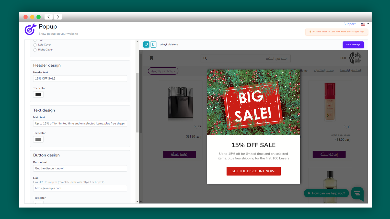 كذلك، إذا كان لديك عروض موسمية أو ترغب في تنشيط قاعدة بيانات العملاء، يمكنك استخدام النافذة المنبثقة لتحفيز العملاء على الاستجابة لرسائلك التسويقية بشكل أسرع قبل مغادرتهم صفحة المتجر.