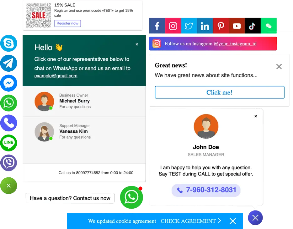 يوفر التطبيق إمكانيات لتخصيص أدوات التفاعل بما يتلاءم مع هوية المتجر ومتطلبات صاحبه. يمكن اختيار أنواع الأدوات التي يتم تفعيلها والتحكم في طريقة ظهورها ومحتواها، ما يمكنك من تقديم تجربة تواصل فريدة تتناسب مع طبيعة منتجاتك وجمهورك المستهدف.